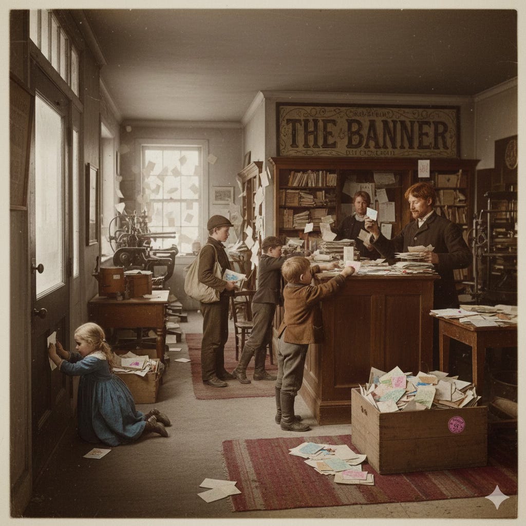 Children plead not to be forgotten; the printer is blamed; parents crowd the Banner office. The city becomes Santa’s post office.